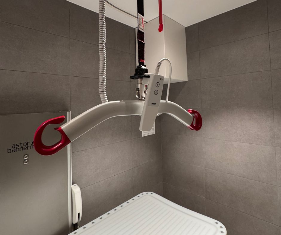 Det er et toalett med tilleggskvaliteter som er stort nok, til de største rullestoler og assistanse, takheis for løft mellom stol, toalett og hev/senk skiftebenk.